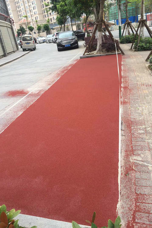 (3)通過與普通路面形成強烈的顏色反差,給駕駛員在視覺上的沖擊,提高駕駛員注意力,采取有效措施減速慢行的效果。熱熔型彩色路面防滑材料主要以熱熔型路面標線涂料為基礎,進行必要的配方調整,同時加入防滑骨料制備而成。施工時,需先加熱溶化后,用專用刮涂推車涂裝在路面上,經自然冷卻硬化形成彩色路面,熱熔型彩色防滑路面產品由于施工相對麻煩,防滑效果一般,質量不大可靠,目前已經基本淘汰。冷涂型彩色防滑路面材料的類型有丙烯酸型、環氧型,氨酯型等,其為液態。施工時,無需大型設備,只需將基料與固化劑按比例混合后,用滾涂的方式涂鋪于路面,并添加防滑骨料,經過化學交聯反應,快速固化成堅韌的漆膜,形成彩色防滑路面。施工簡單,快速簡便,目前已經成為市場主要的選擇對象。